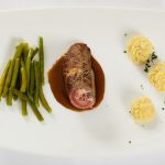 Dry-Aged Beef Strips with oven roasted pumpkin and herb sauce